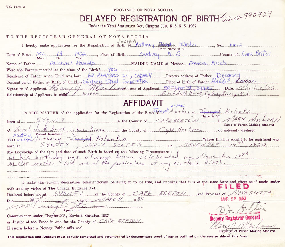 I hereby make application for the Registration of Birth of Joseph AnthonyKolanko Sex Male