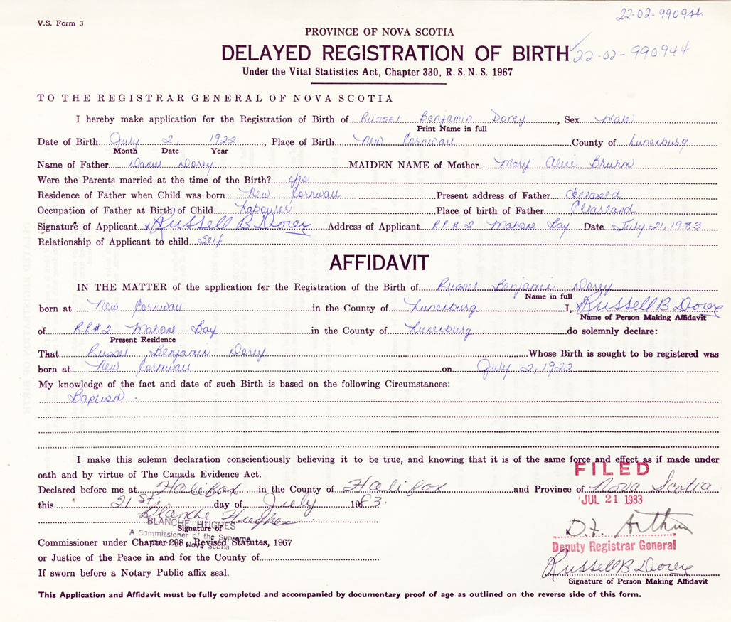 Date of Birth July 2, 1922 Place of Birth New CornwallCounty of Lunenburg