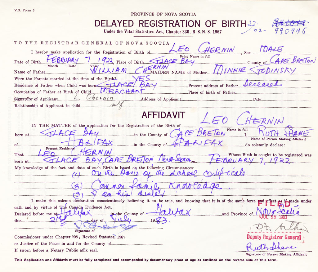 I hereby make application for the Registration of Birth of LeoChernin Sex Male