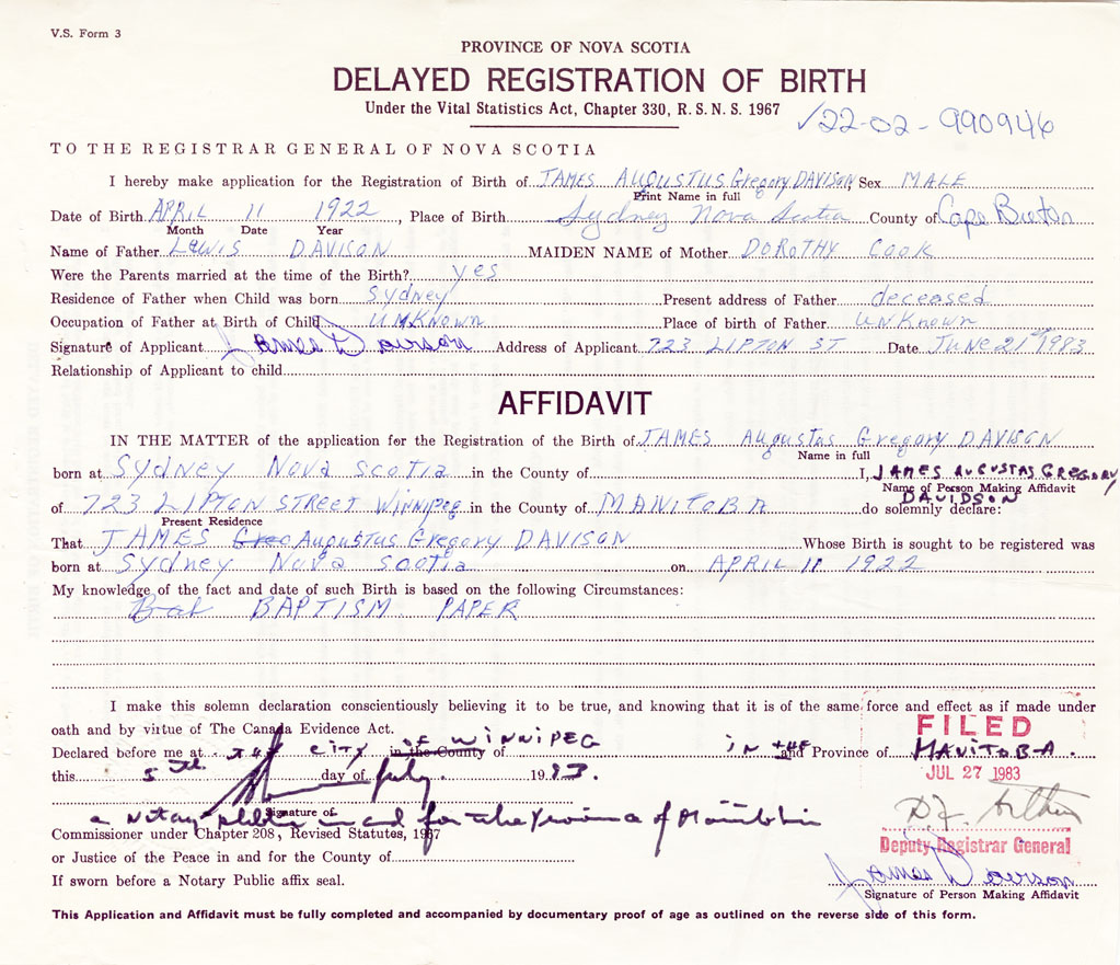 I hereby make application for the Registration of Birth of James AugustusDavison Sex Male