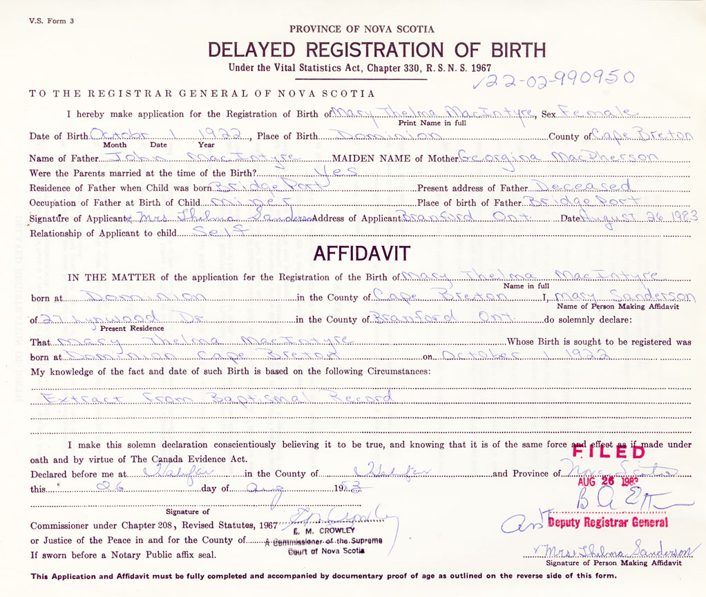 IN THE MATTER of the application for the Registration of the Birth of Mary ThelmaMacIntyre