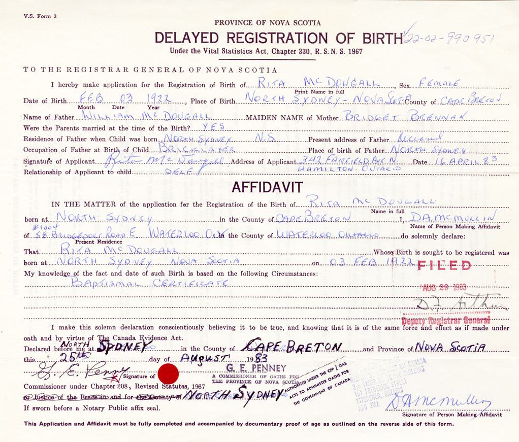 I hereby make application for the Registration of Birth of RitaMcDougall Sex Female