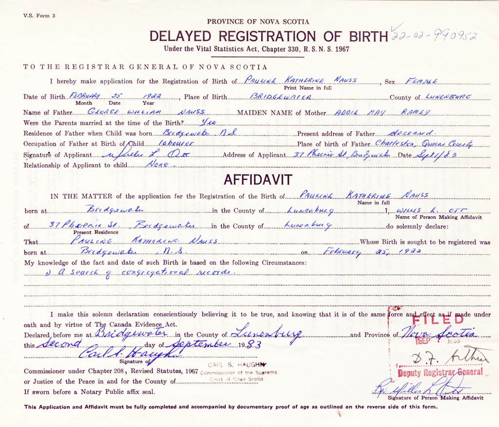 Date of Birth February 25, 1922 Place of Birth BridgewaterCounty of Lunenburg