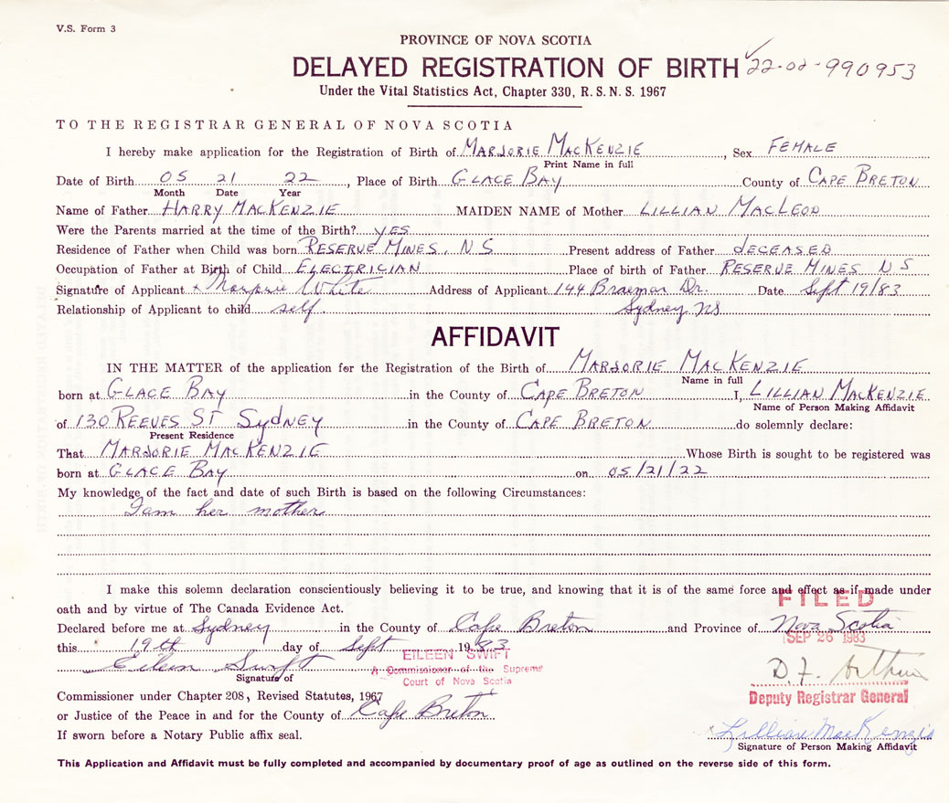 Date of Birth May 21, 1922 Place of Birth Glace BayCounty of Cape Breton
