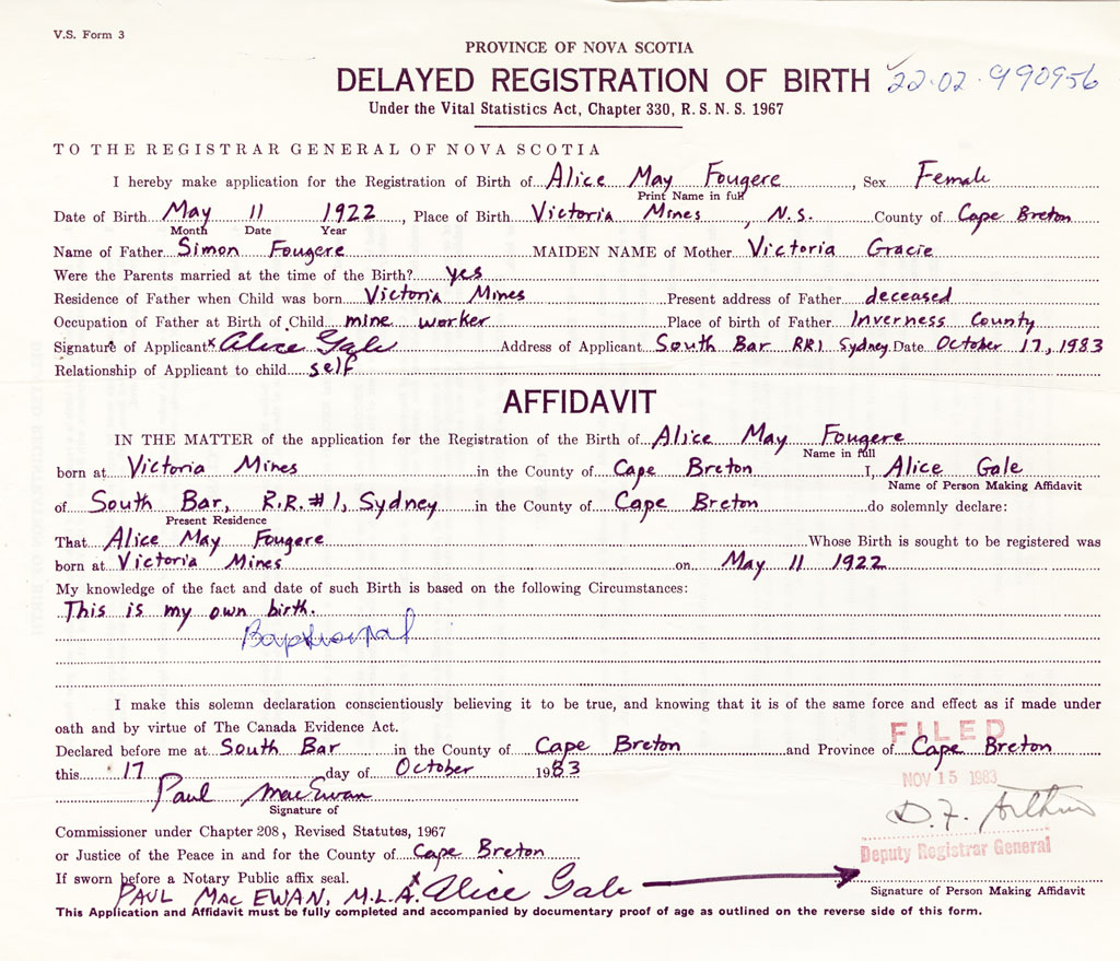 Signature of Applicant Alice Gale Address of Applicant RR #1, South Bar, Sydney, Cape Breton Date 17 October 1983