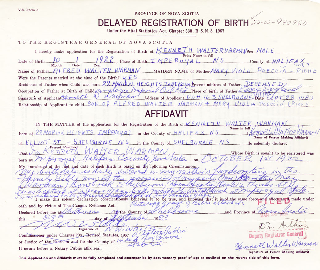 My birth date is duly entered in my mothers handwriting in the family bible now in the possession of my sister (Mrs. Dorothy Mae Warman), Bowbrick, Shelburne, Box 613, thomas Street. I was baptized at 3 years of age by the Minister of the United Church at Imperoyal, Halifax I was entered on the Church cradle roll at 3-4 months of age. Photocopy of page of bible attached.