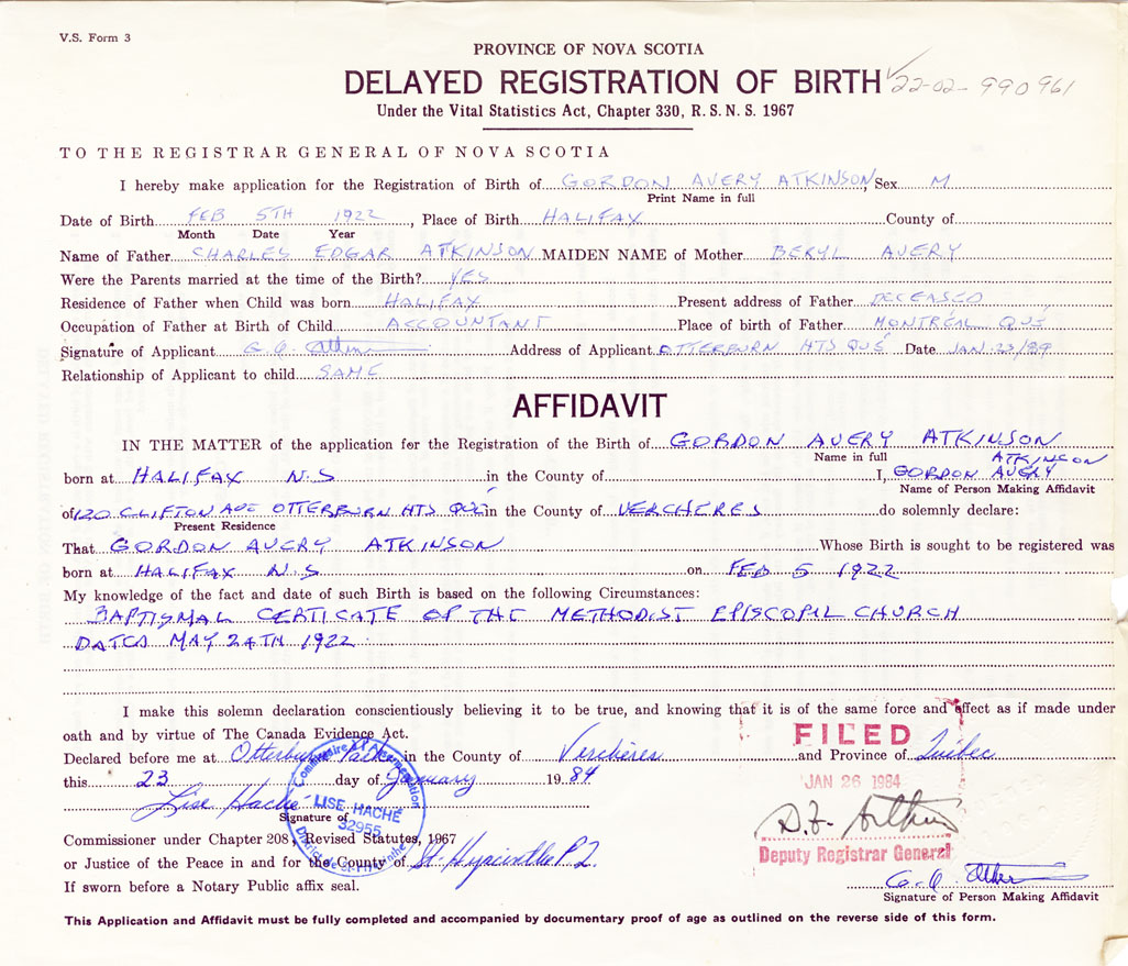 I hereby make application for the Registration of Birth of Gordon AveryAtkinson Sex Male
