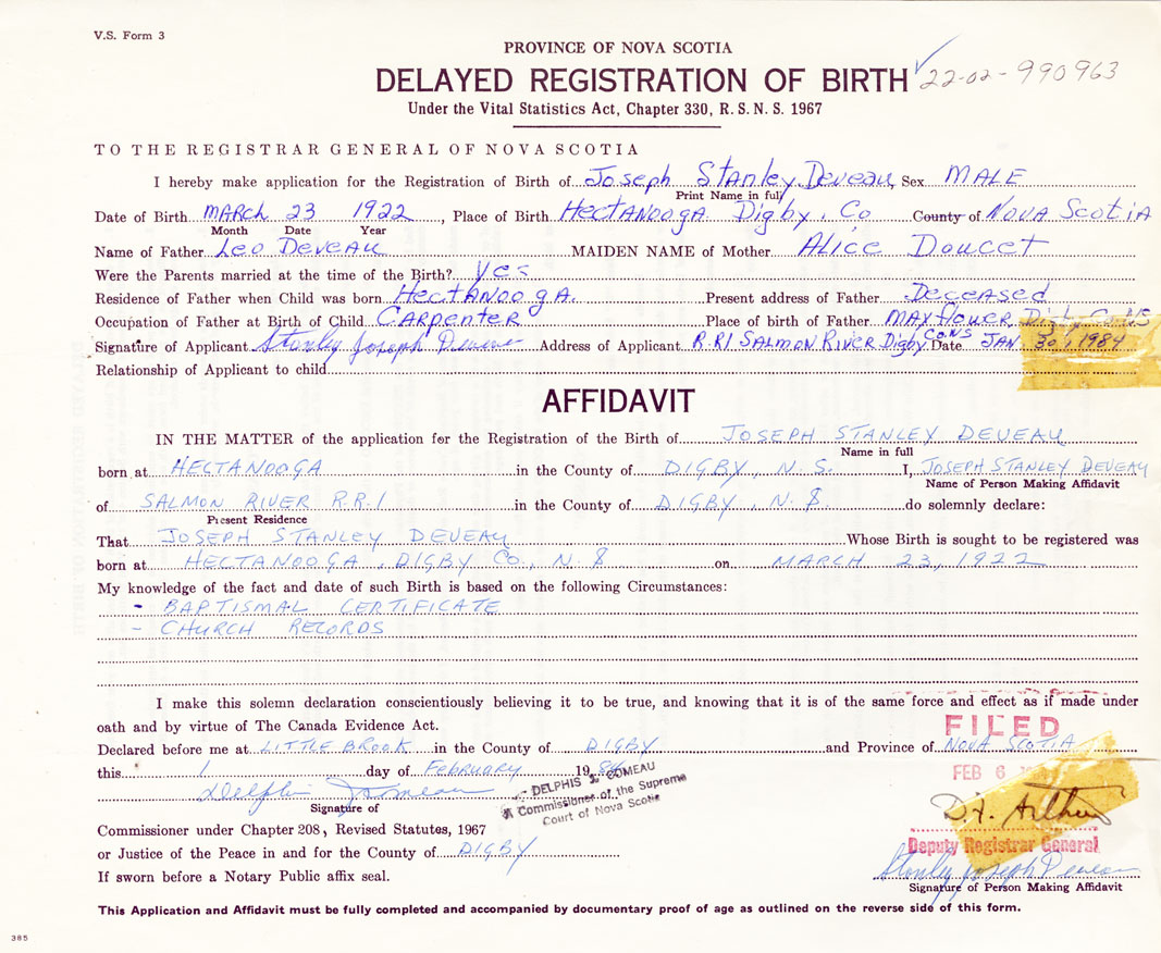 Signature of Applicant Stanley Joseph Deveau Address of Applicant RR #1, Salmon River, Digby Date 30 January 1984