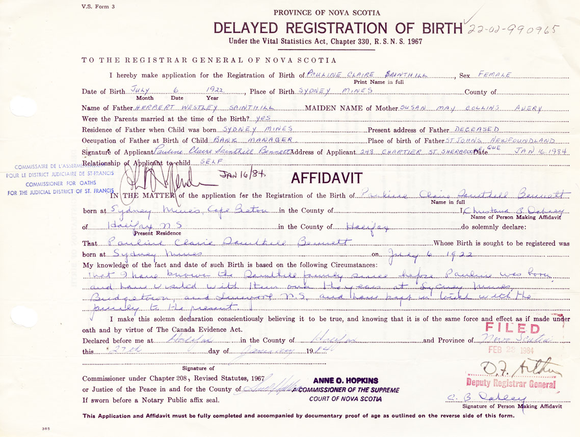 Signature of Applicant Pauline Claire Sainthill Bennett Address of Applicant 248 Chartier Street, Sherbrooke, Quebec Date 16 January 1984
