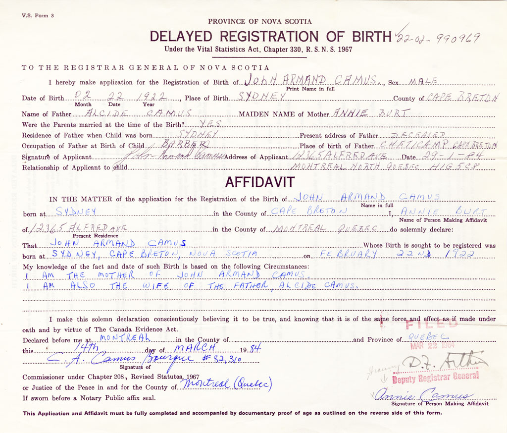 I hereby make application for the Registration of Birth of John ArmandCamus Sex Male