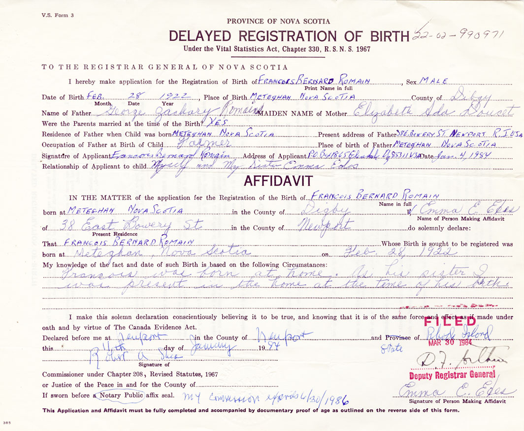 Date of Birth February 28, 1922 Place of Birth MeteghanCounty of Digby
