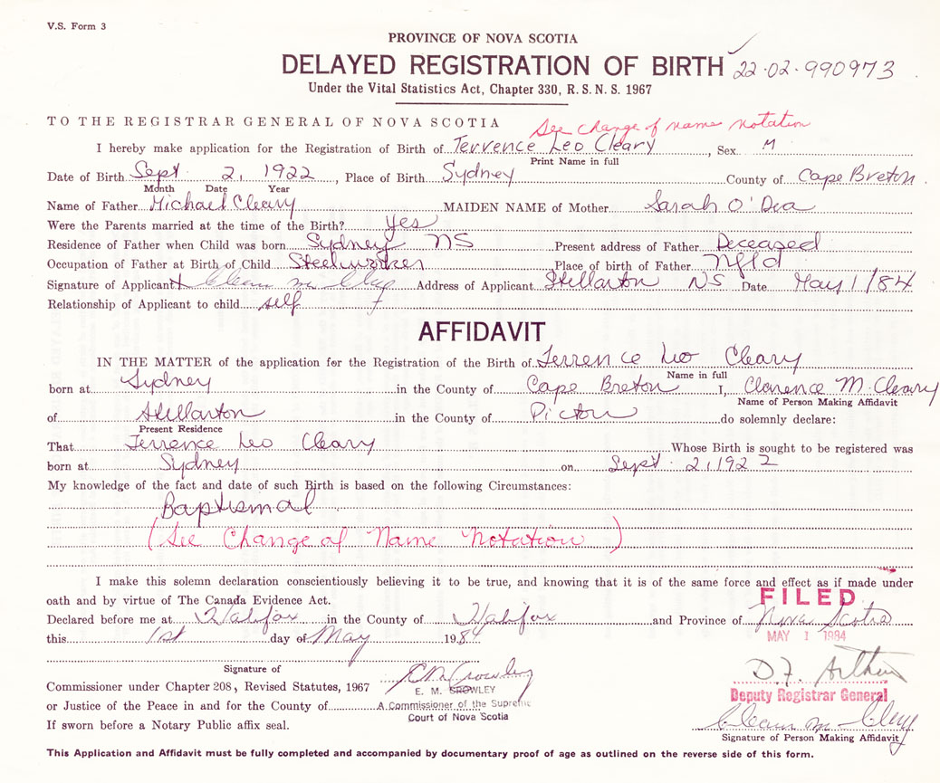 Signature of Applicant Clarence M. Cleary Address of Applicant Stellarton, Pictou Date 1 May 1984