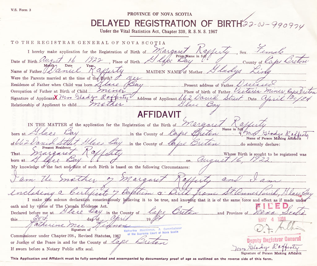 I am the mother of Margaret Rafferty and I am enclosing a certificate of baptism and birth from St. Annes Parish, Glace Bay, Cape Breton