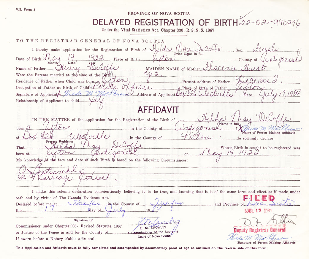 IN THE MATTER of the application for the Registration of the Birth of Hilda MayDeCoffe