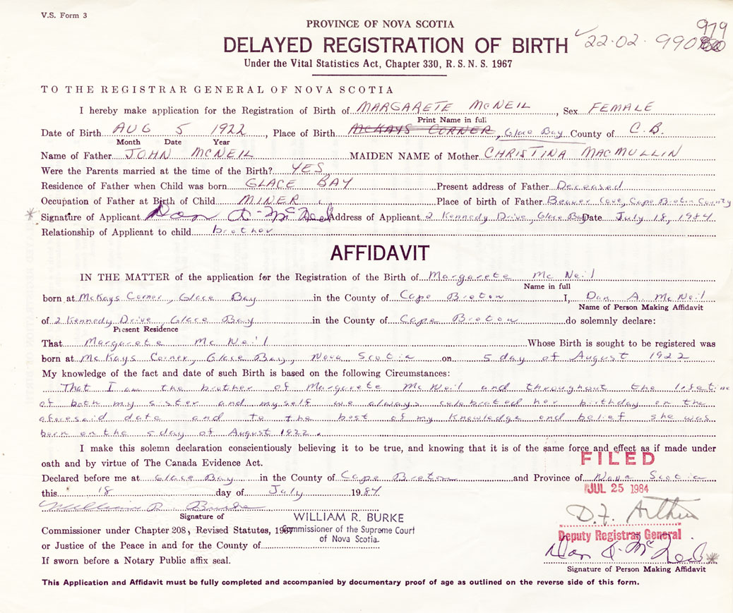 That I am the brother of Margarete McNeil and throughout the lifetime of both my sister and myself we always celebrated her birthday on the aforesaid date and to the best of my knowledge and belief she was born on the 5 day of August 1922.