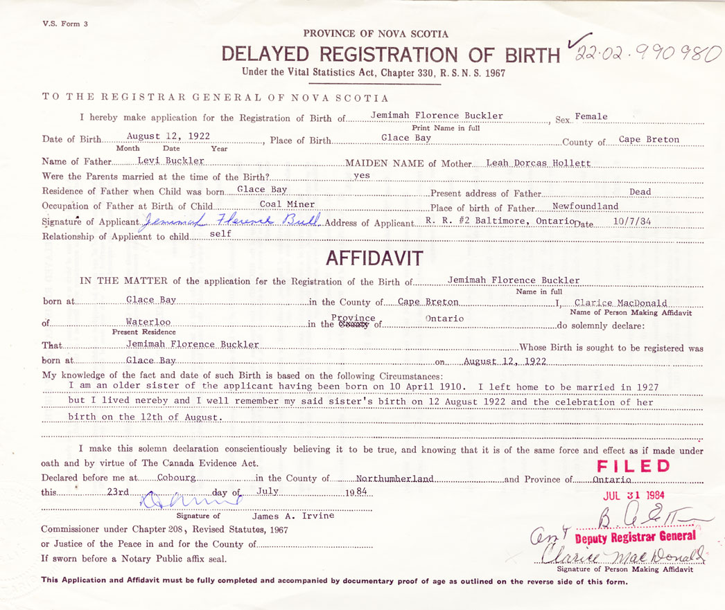 Signature of Applicant Jemimah Florence Bull Address of Applicant RR #2, Baltimore, Ontario Date 10 July 1984