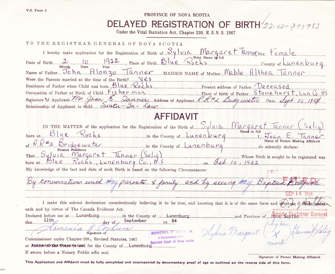 Date of Birth February 10, 1922 Place of Birth Blue RocksCounty of Lunenburg