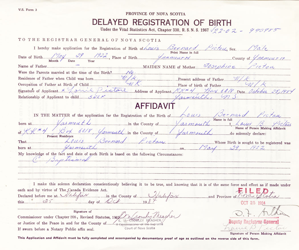 I hereby make application for the Registration of Birth of Louis BernardPictou Sex Male