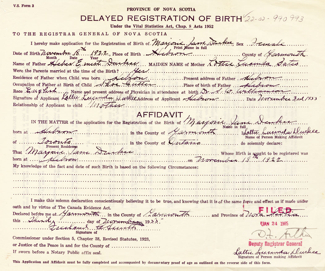 Date of Birth November 18, 1922 Place of Birth HebronCounty of Yarmouth