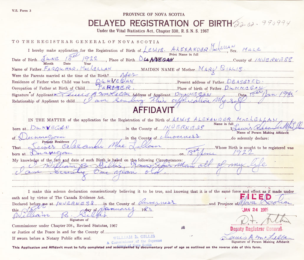 I hereby make application for the Registration of Birth of Lewis AlexanderMacLellan Sex Male