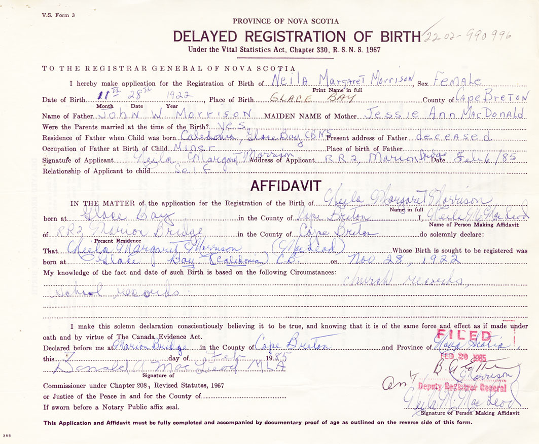 Signature of Applicant Neila Margaret Morrison Address of Applicant RR #2, Marion Bridge, Cape Breton Date 6 February 1985