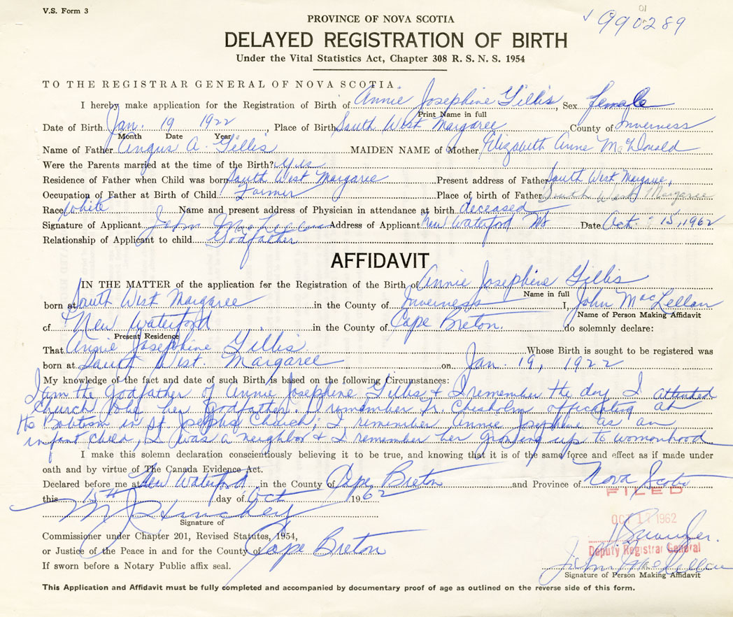 I am the godfather of Annie Josephine Gillis and I remember the day I attended church to be her godfather. I remember Father Chisholm officiating at the baptism in St. Josephs Church; I remember Annie Josephine as an infant child, I was a neighbor and I remember her growing up to womanhood.