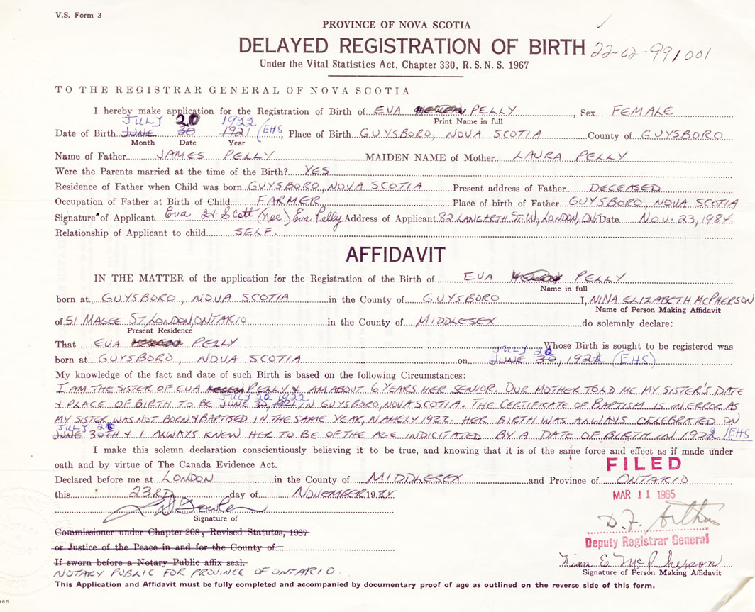 I am the sister of Eva Pelly and am about 6 years her senior. Our Mother told me my sisters date and place of birth to be July 20, 1922 in Guysborough. The certificate of baptism is in error as my sister was not born and baptized in the same year, namely 1922. Her birth was always celebrated on July 20 and I always knew her to be of the age indicated by a date of birth in 1922. (signed Nina Elizabeth McPherson)