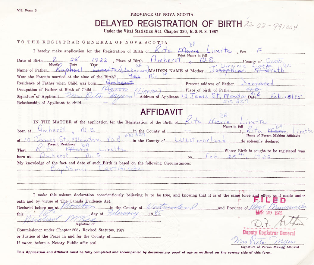 Signature of Applicant Mrs. Rita Myers (nee: Lirette) Address of Applicant 10 James Street, Moncton, New Brunswick, E1C 3Z7 Date 18 February 1985