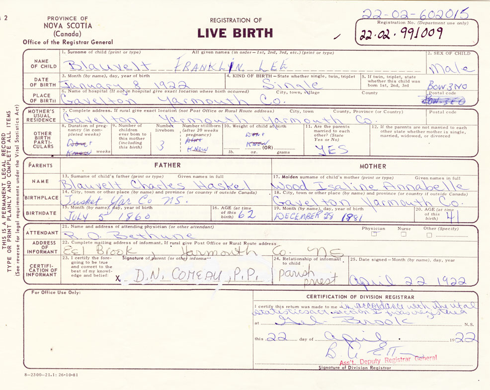 Date of Birth January 8, 1922 Place of Birth GaveltonCounty of Yarmouth