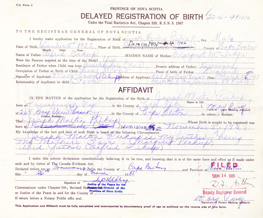Signature of Applicant Mary Casey (nee: Pickup) Address of Applicant 268 Bayview Court, Mitchell Avenue, Dominion, Cape Breton, B0A 1E0 Date 26 March 1985