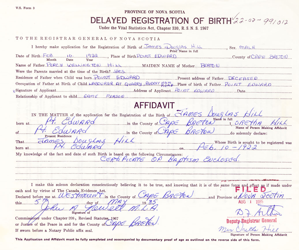 Date of Birth February 10, 1922 Place of Birth Point EdwardCounty of Cape Breton