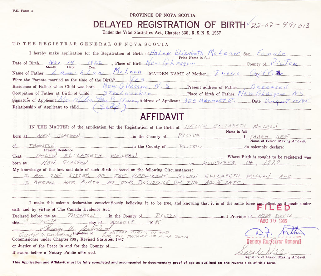 I am the sister of the applicant, Helen Elizabeth McLean and I recall her birth at our residence on the above date.