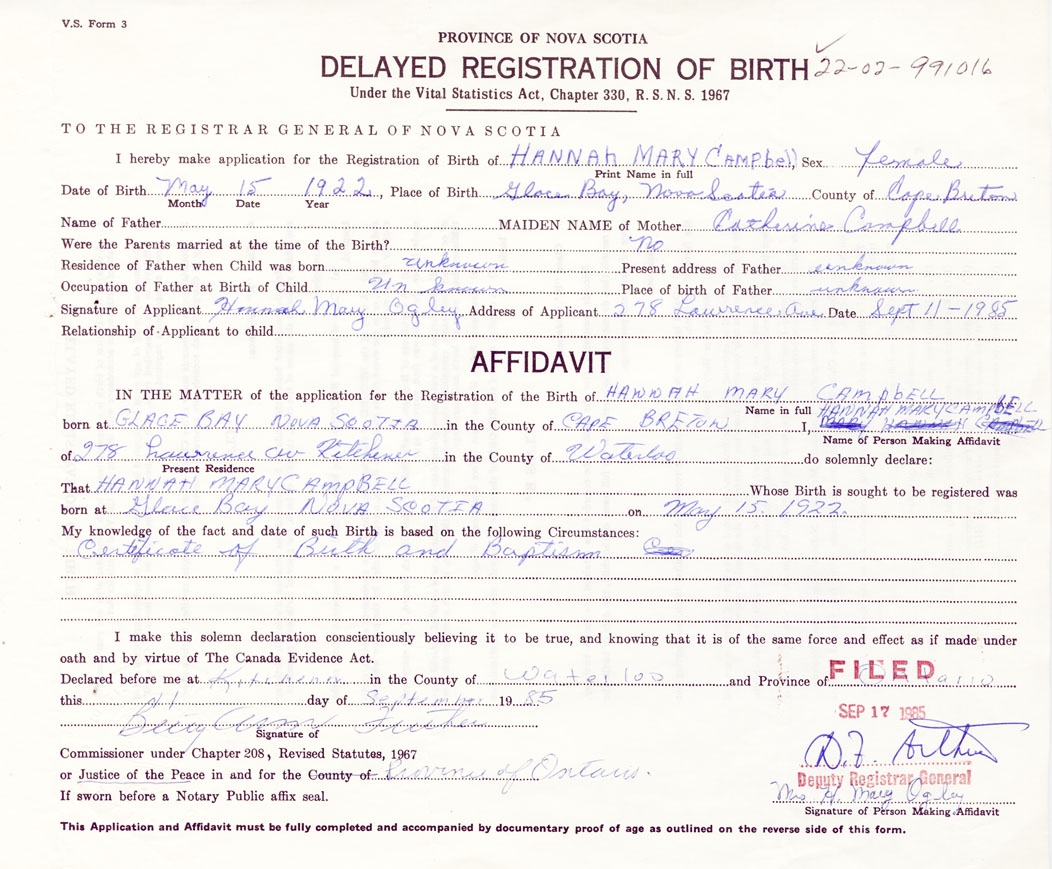 Date of Birth May 15, 1922 Place of Birth Glace BayCounty of Cape Breton