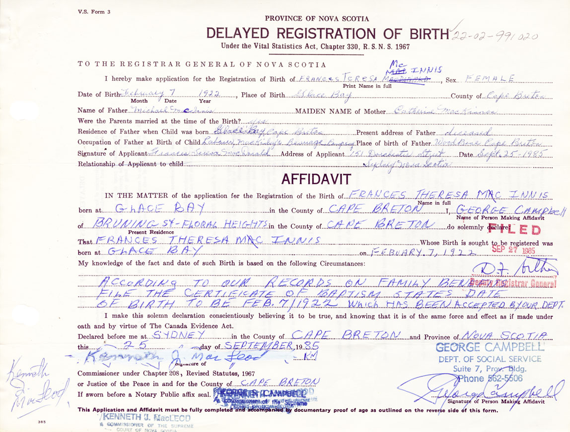 Signature of Applicant Frances Teresa MacDonald Address of Applicant 151 Dorchester Street, Sydney, Cape Breton Date 25 September 1985