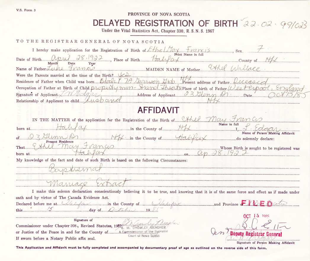 IN THE MATTER of the application for the Registration of the Birth of Ethel MayFrancis