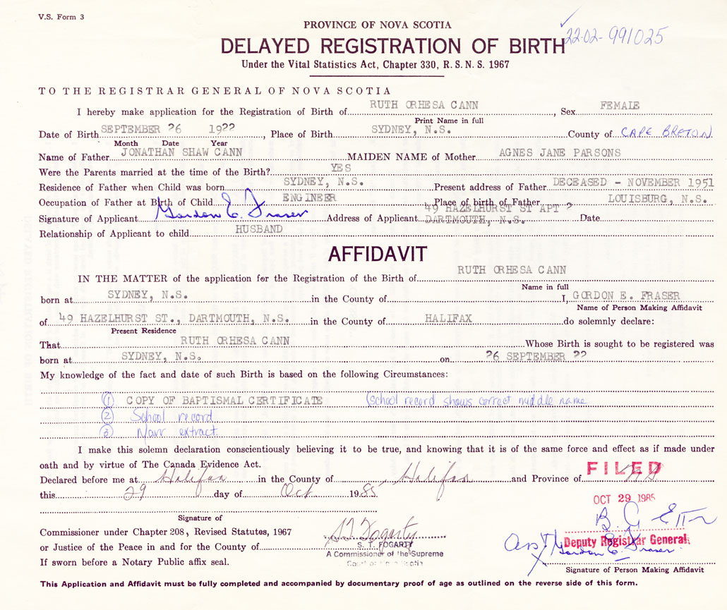I hereby make application for the Registration of Birth of Ruth OrhesaCann Sex Female