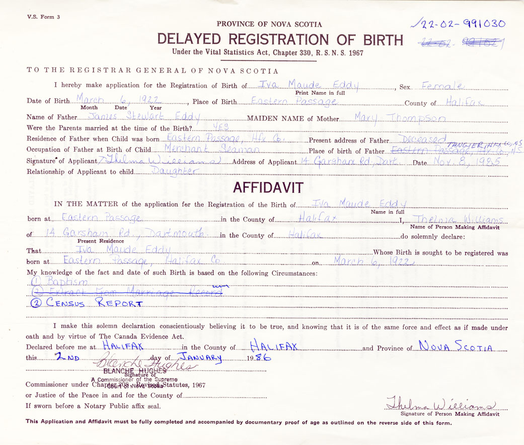 Date of Birth March 6, 1922 Place of Birth Eastern PassageCounty of Halifax