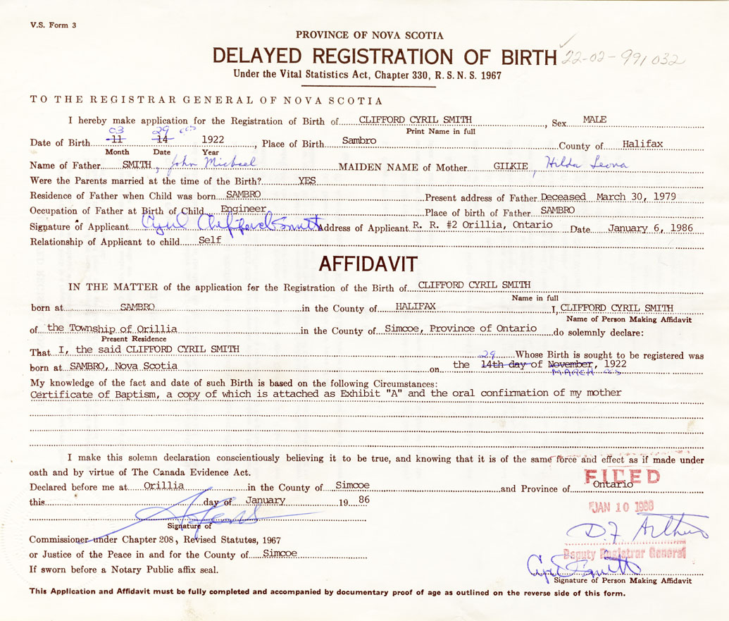 Signature of Applicant Cyril Clifford Smith Address of Applicant RR #2, Orillia, Ontario Date 6 January 1986