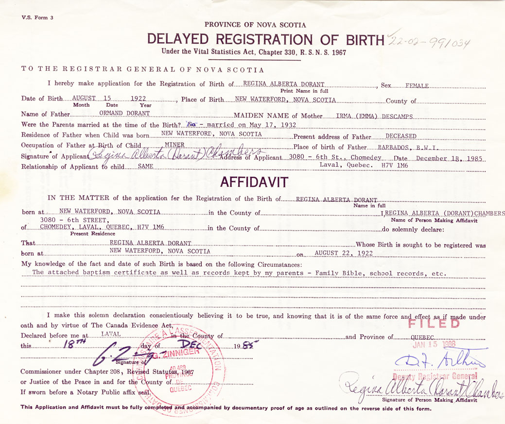 I hereby make application for the Registration of Birth of Regina AlbertaDorant Sex Female