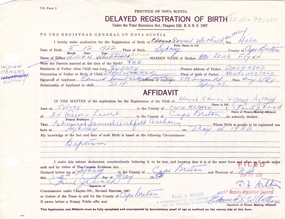 Signature of Applicant Edmund Samuel Whitfield Anthony Address of Applicant 298 Lingan Road, Sydney, Cape Breton Date 5 May 1983