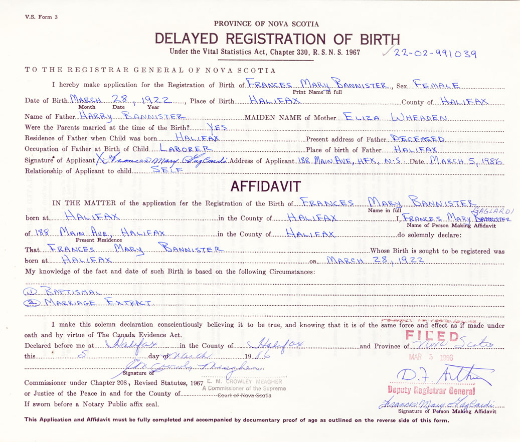 Signature of Applicant Frances Mary Gaglardi Address of Applicant 188 Main Avenue, Halifax Date 5 March 1986