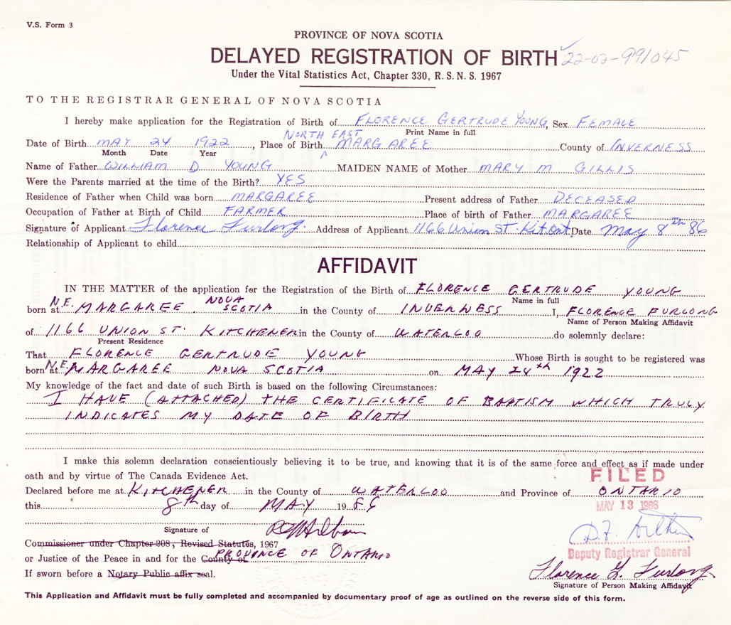 Signature of Applicant Florence Furlong Address of Applicant 1166 Union Street, Kitchener, Ontario Date 8 May 1986