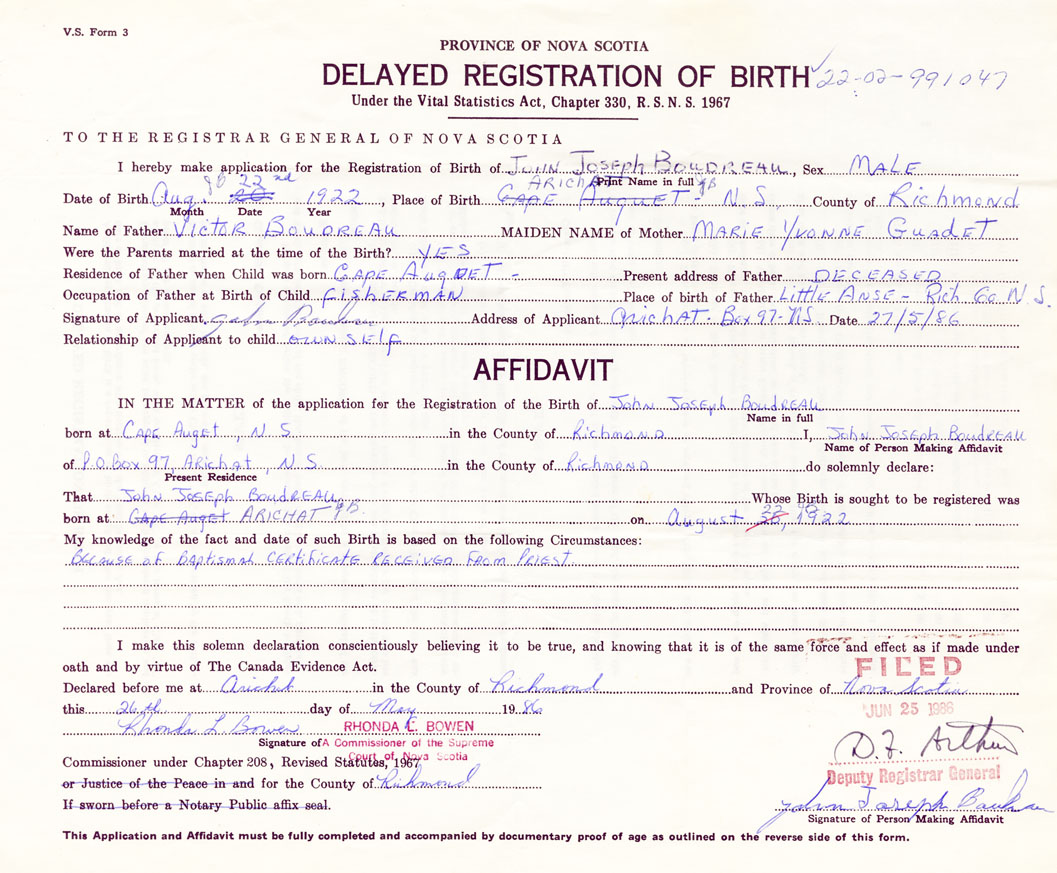 Signature of Applicant John Boudreau Address of Applicant Box 97, Arichat, Richmond Date 27 May 1986