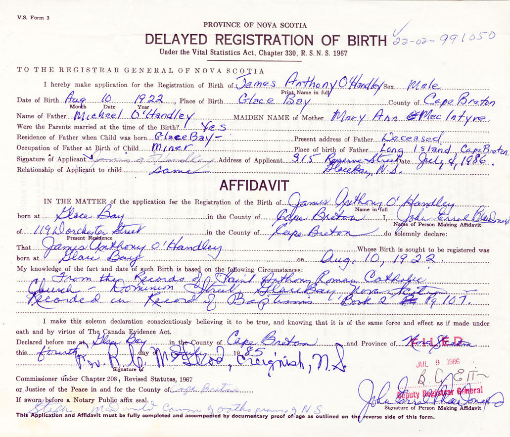 Signature of Applicant James O'Handley Address of Applicant 315 Reserve Street, Glace Bay, Cape Breton Date 4 July 1986