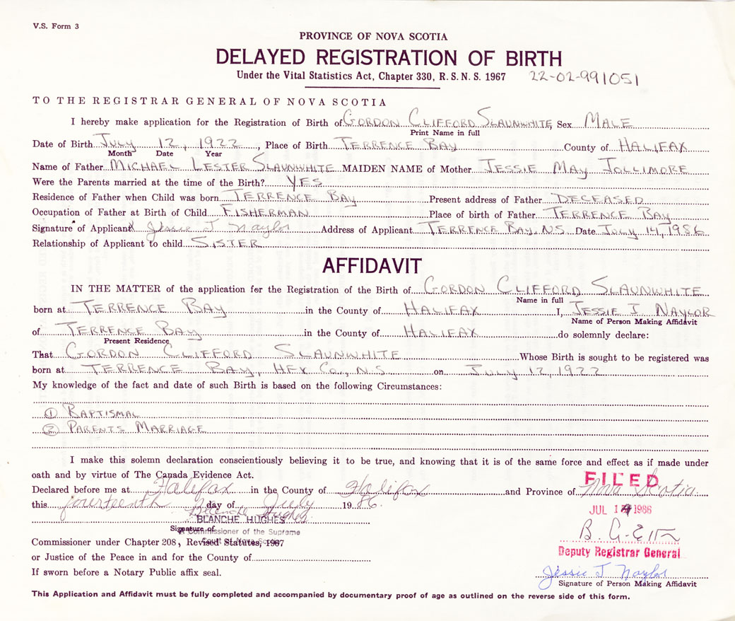 Date of Birth July 12, 1922 Place of Birth Terence BayCounty of Halifax