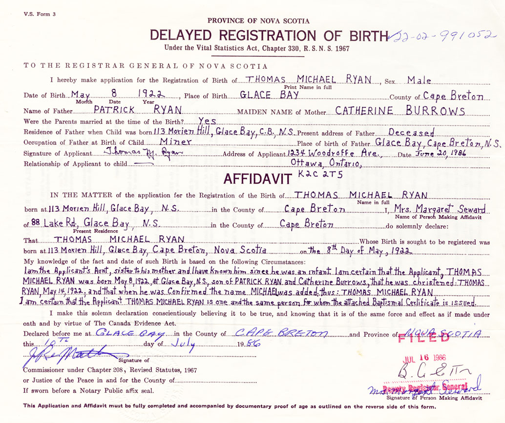 I am the applicants Aunt, sister to his mother and I have known him since he was an infant. I am certain that the applicant, Thomas Michael Ryan was born May 8, 1922 at Glace Bay, son of Patrick Ryan and Catherine Burrows, that he was christened Thomas Ryan, May 14, 1922 and that when he was confirmed the name Michael was added: thus: Thomas Michael Ryan. I am certain that the applicant Thomas Michael Ryan is one and the same person for whom the attached baptismal certificate is issued.