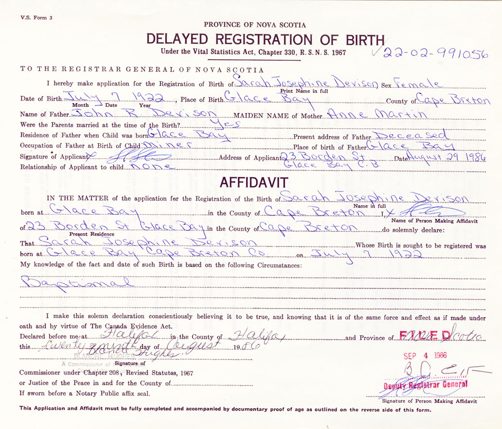 Date of Birth July 7, 1922 Place of Birth Glace BayCounty of Cape Breton