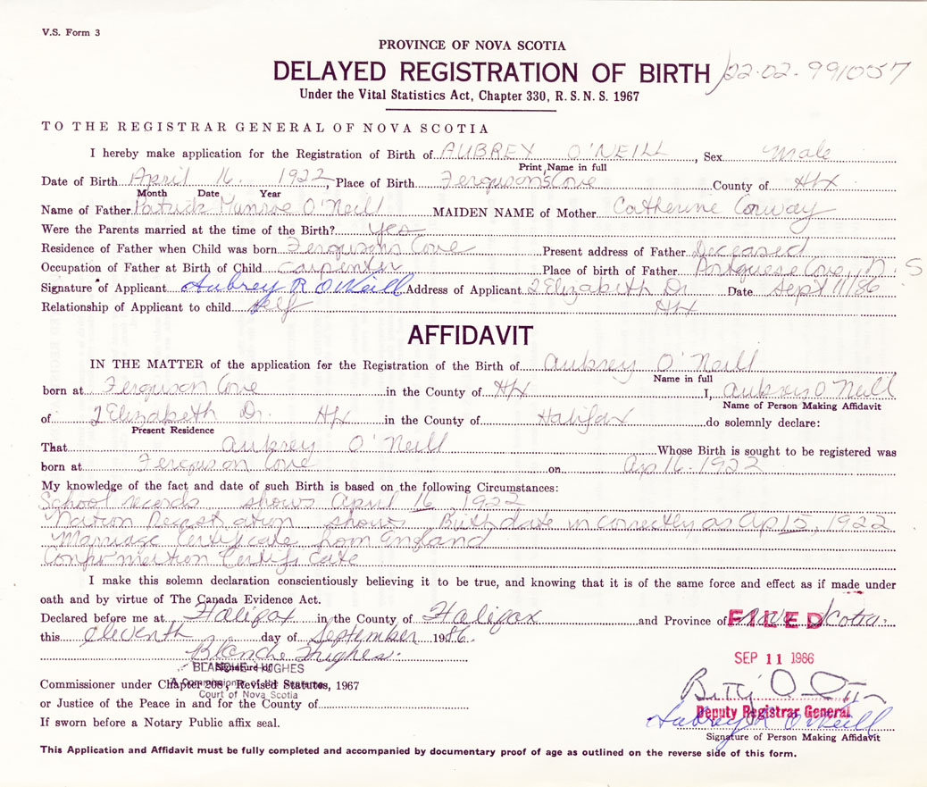 Signature of Applicant Aubrey R. O'Neill Address of Applicant 2 Elizabeth Drive, Halifax Date 11 September 1986