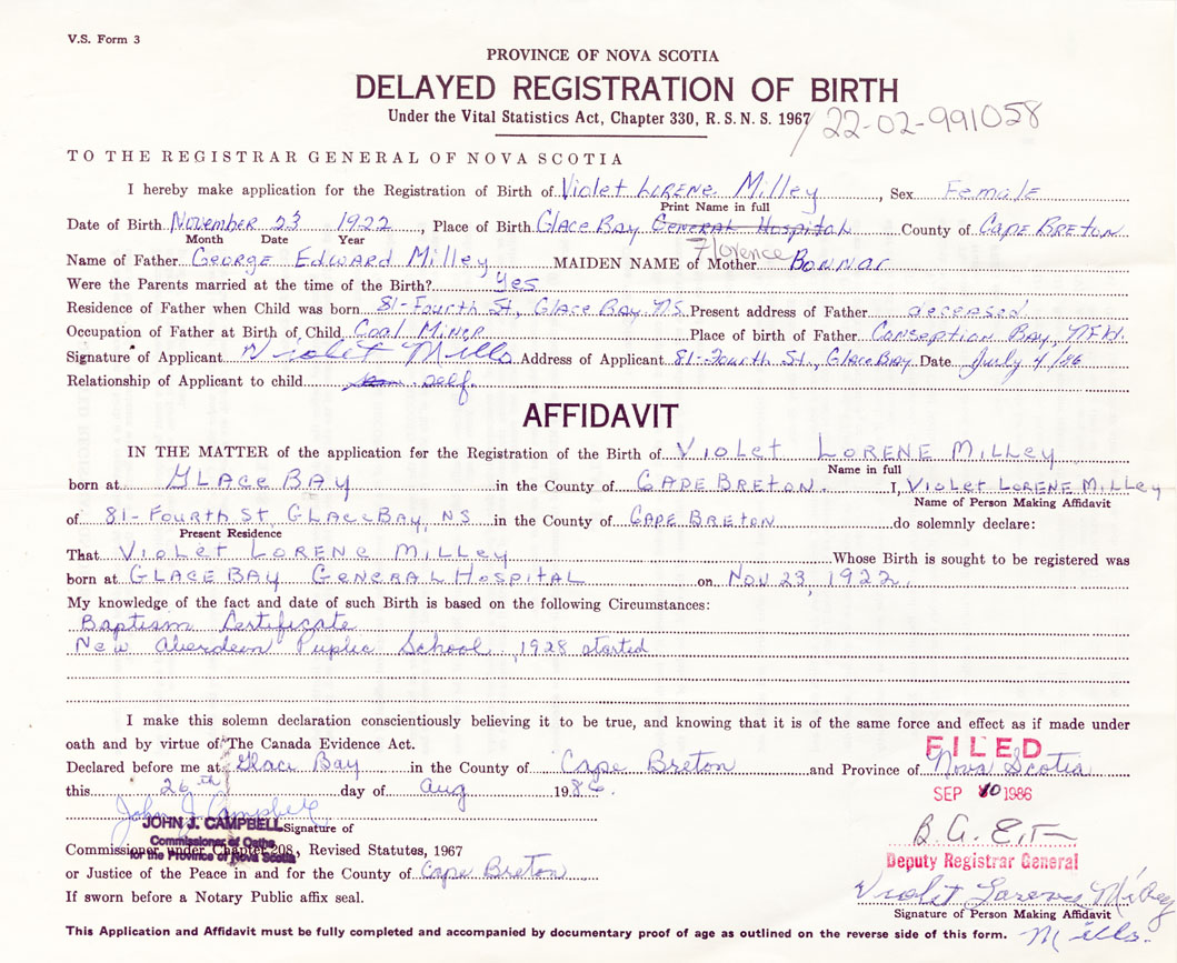 Signature of Applicant Violet Milley Address of Applicant 81 Fourth Street, Glace Bay, Cape Breton Date 4 July 1986