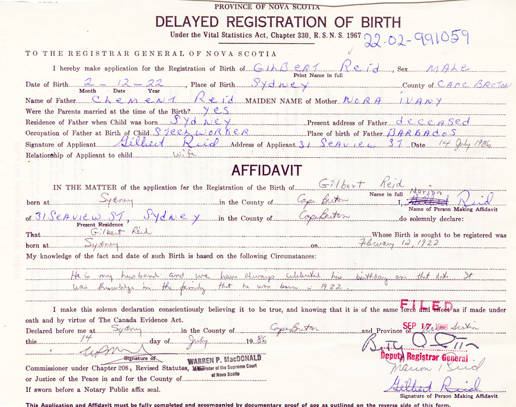 Signature of Applicant Gilbert Reid Address of Applicant 31 Seaview Street, Sydney, Cape Breton Date 14 July 1986